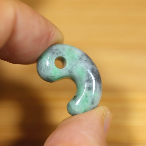 商品説明 小滝産の翠と黒が混じり合った、若干小振りな勾玉です、目立ったヒビはありません。 |